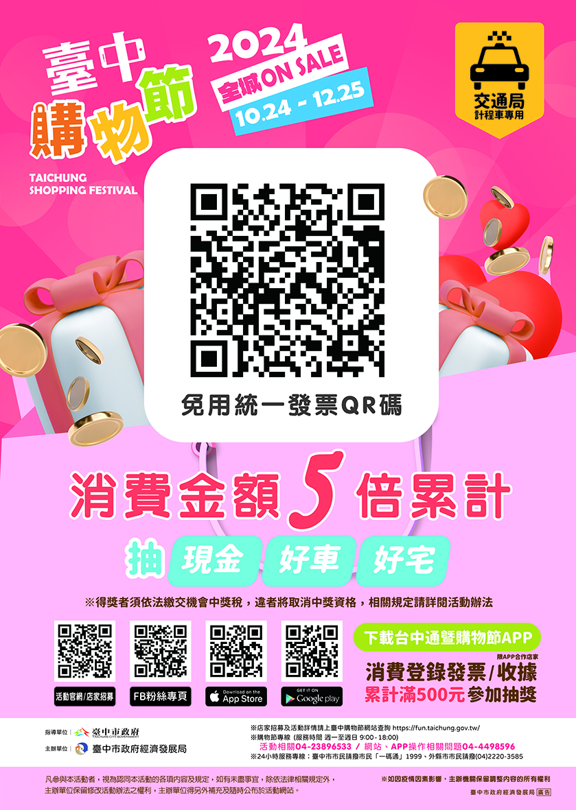葉局長指出,台中購物節今年邁向第六屆,天天抽現金、週週抽大獎,也帶動城市行銷邁向國際,活動期間吸金與吸睛效益驚人,過去5年來已突破千億的消費紀錄,成為台中的城市品牌活動,除了吃喝玩樂等消費,民眾搭乘計程車同樣能參加購物節抽獎,在抵達目的地後,記得向計程車駕駛索取計程車乘車證明,並開啟「台中通暨購物節APP」,掃描車內台中購物節計程車QR-CODE後,依計程車乘車證明顯示的車資登錄即可累計金額及資格參加購物節活動。