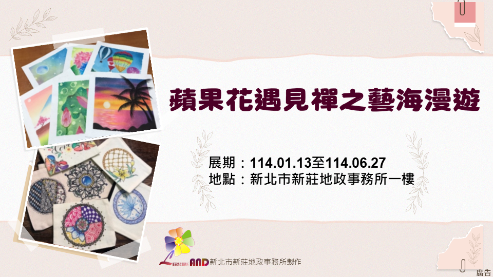 新北市新莊地政事務所將自114年1月13日(星期一)起至6月27日(星期五)止,於該所一樓展出「蘋果花遇見禪之藝海漫遊」手作展,同時於線上分享陳列作品,歡迎喜愛藝術的民眾蒞臨或至該所全球資訊網的網路藝廊觀賞。